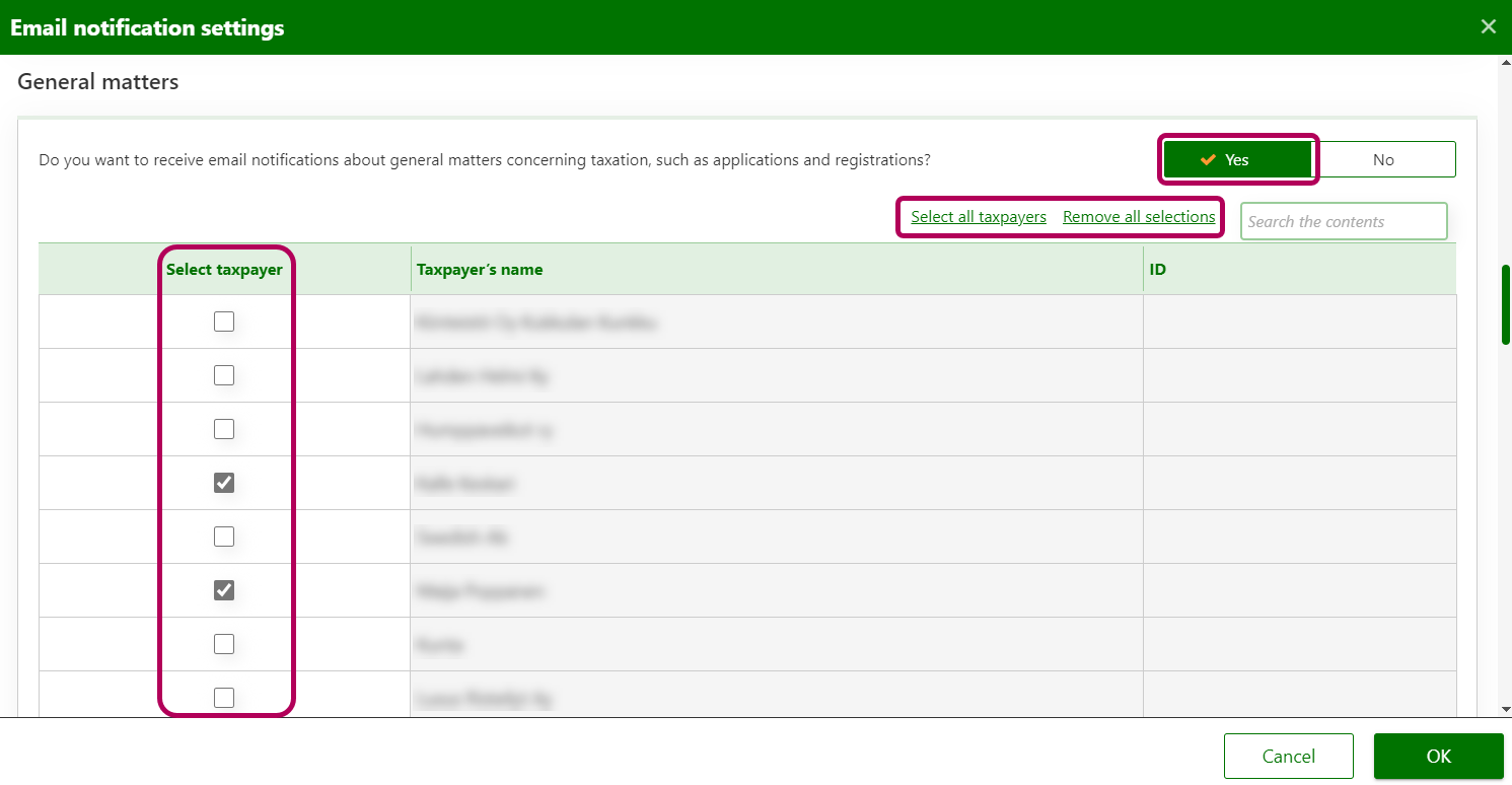First select Yes in the General matters section. Then select the clients whose tax matters you want to be notified of.