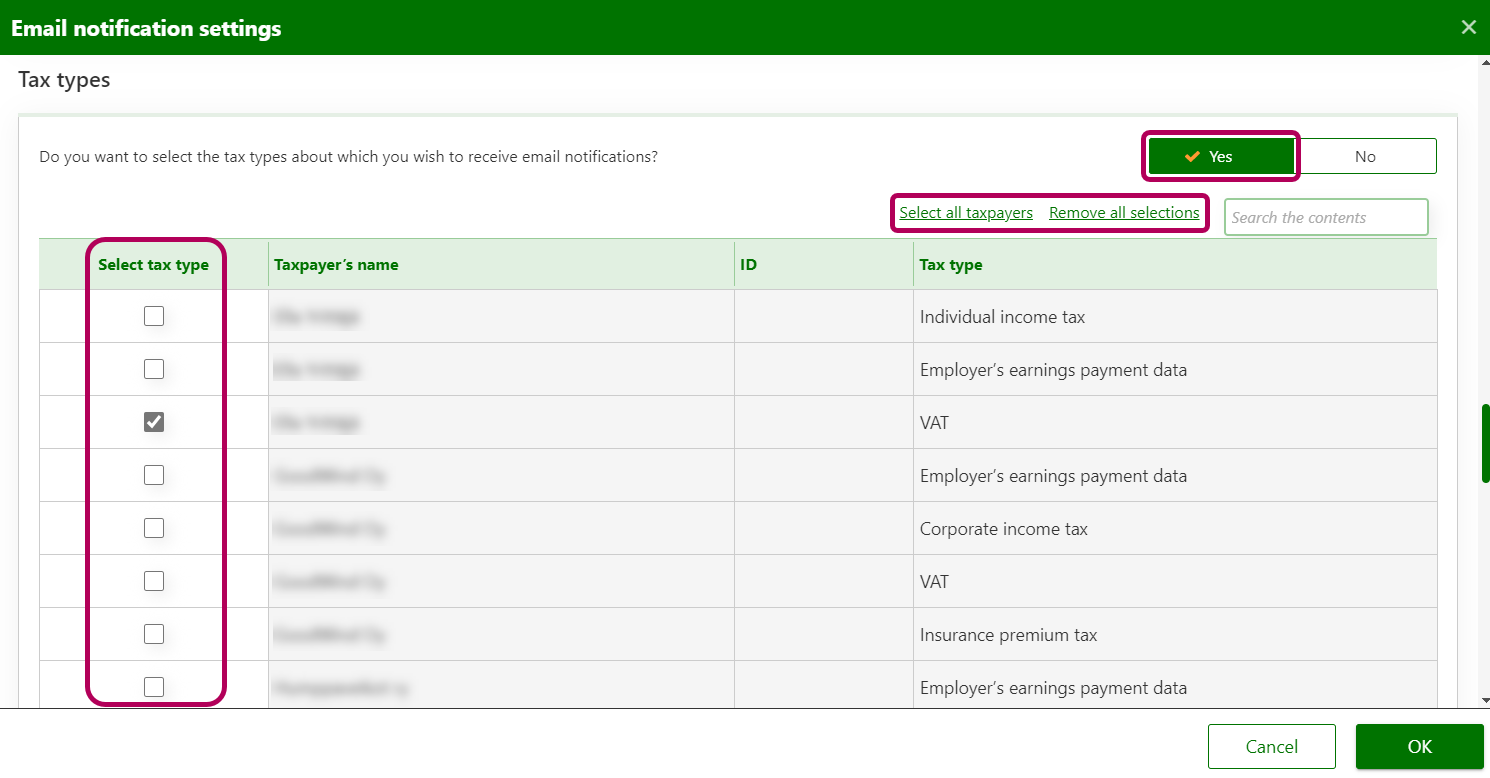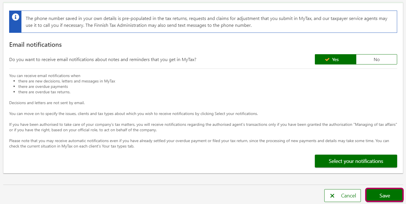 - which tax matters you want to be notified of: payment reminders, general tax matters – such as applications and registrations – or certain tax types, such as the value added tax.