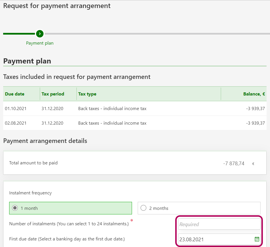 There can be 1–24 instalments. The interval between instalments is always 1 month. If you have only back taxes, prepayments, inheritance tax, gift tax and real estate tax to pay, you can choose the interval between the instalments to be 2 months. In that case, the maximum number of instalments is 12. The first due date must be within 30 days from the date when you submitted the request for payment arrangement.