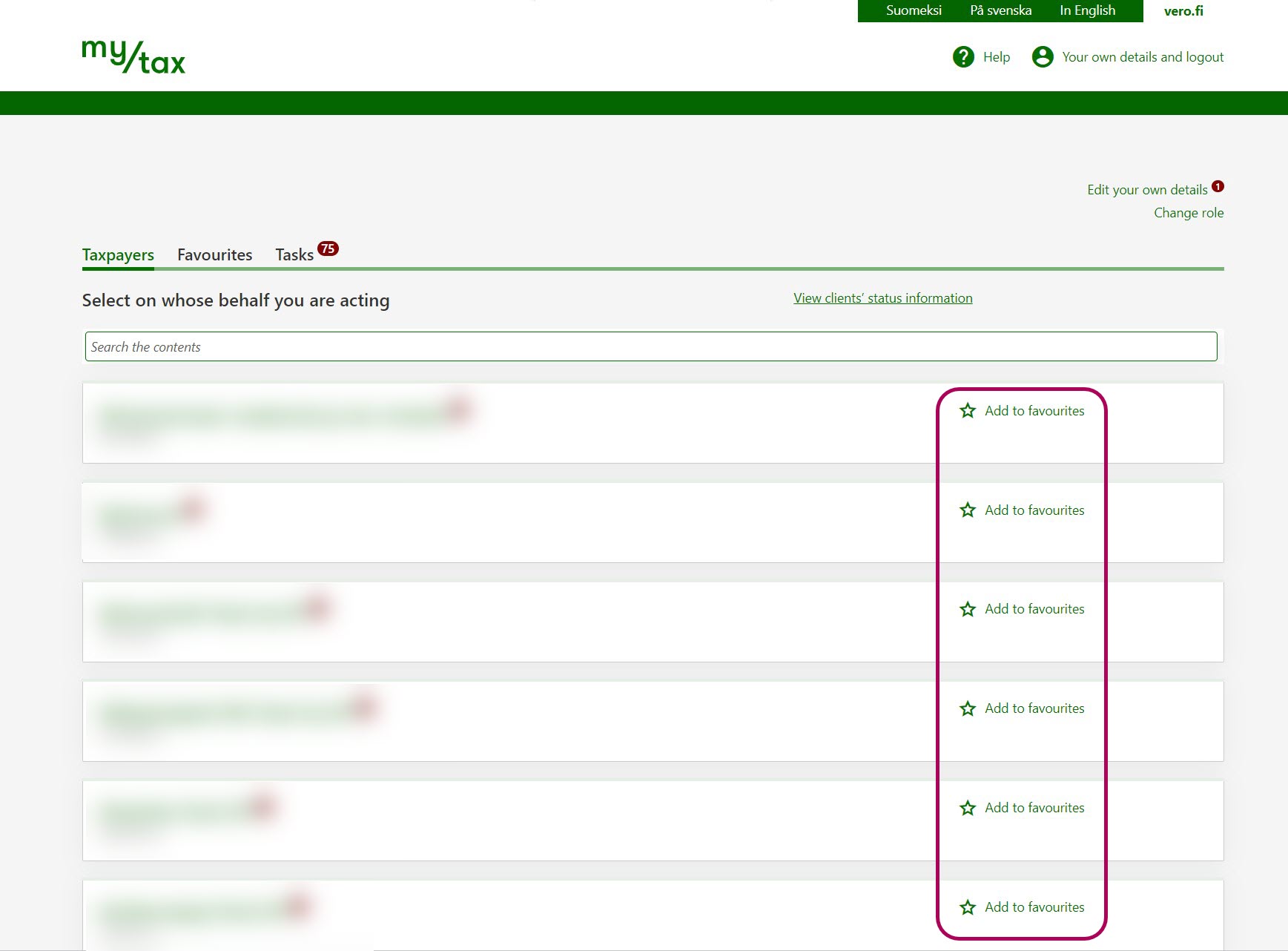 If you have more than 300 customers: You can add favourites on the Taxpayers tab by clicking Open the complete list of taxpayers.