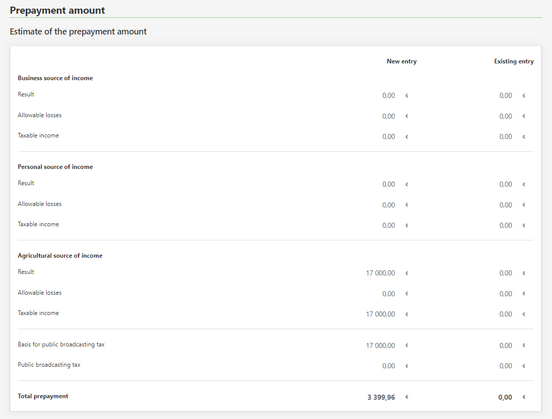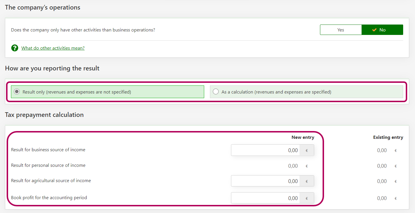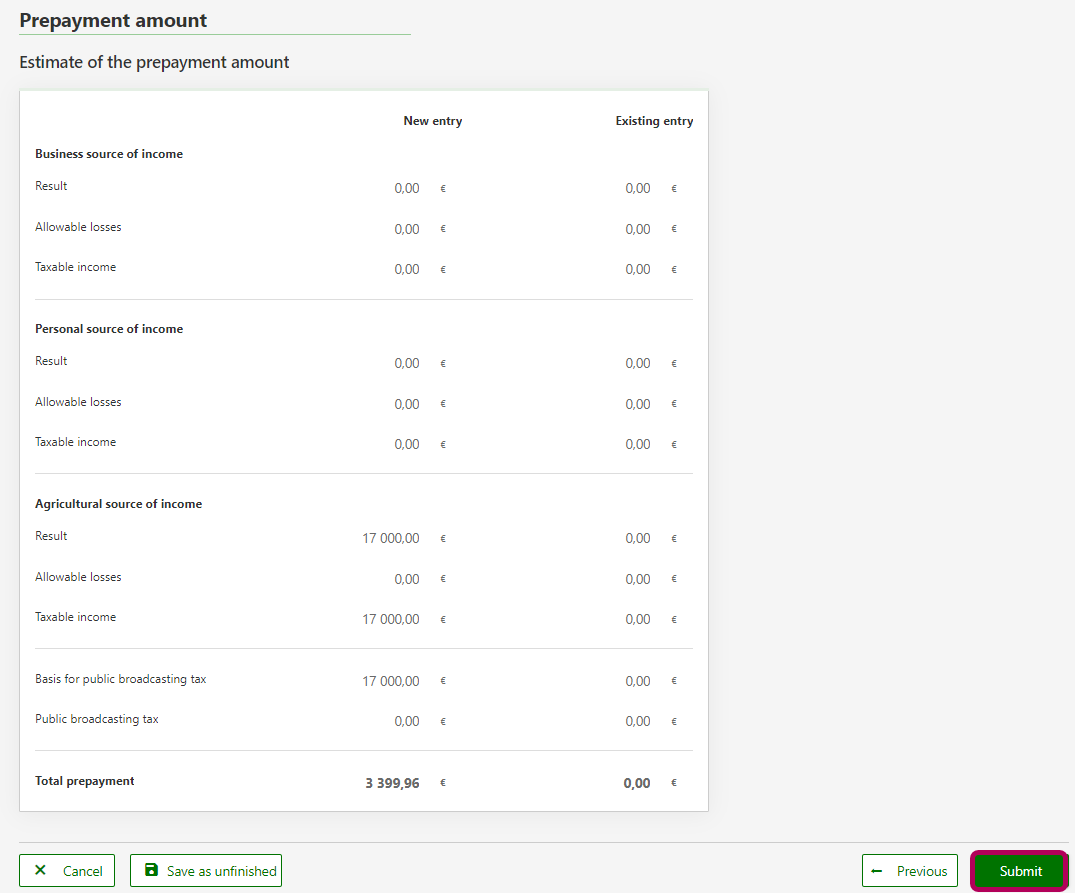 Stage Profit: If you are requesting prepayment for the current or the next tax period, you can choose whether to file only your business income or a more detailed calculation. Fill in the necessary details.