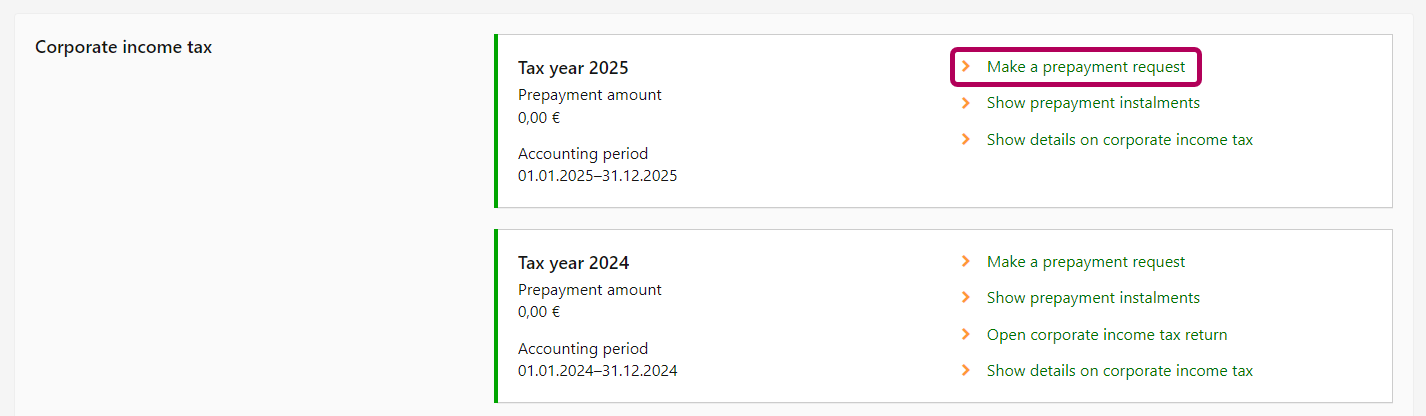 Click the link Make a prepayment request next to the correct year in the Corporate income tax section.