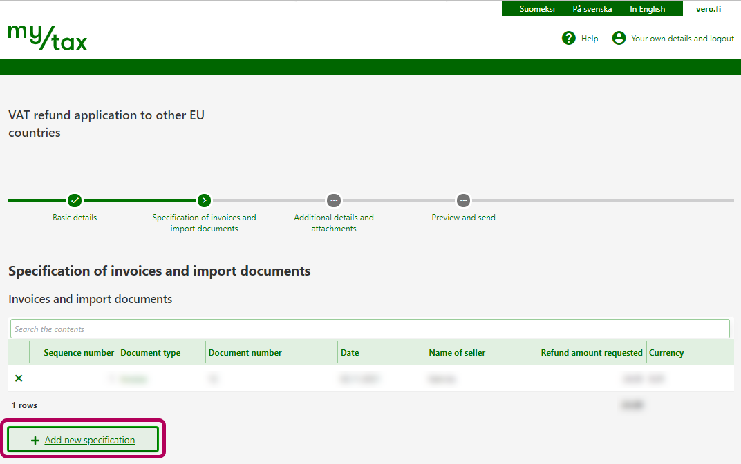 You can add new invoices and import documents by clicking Add new specification. When you have added all the specifications, go to Additional details and attachments.