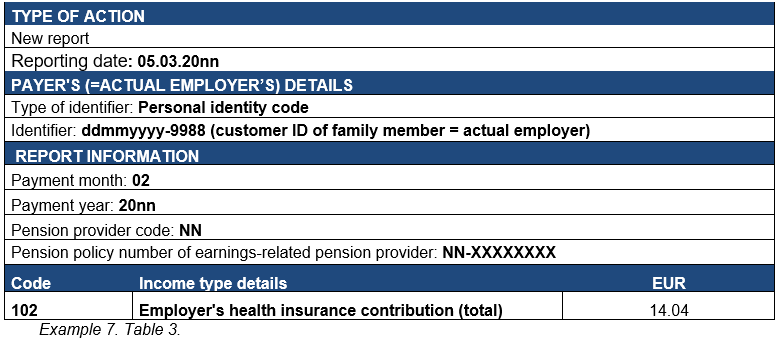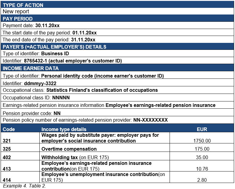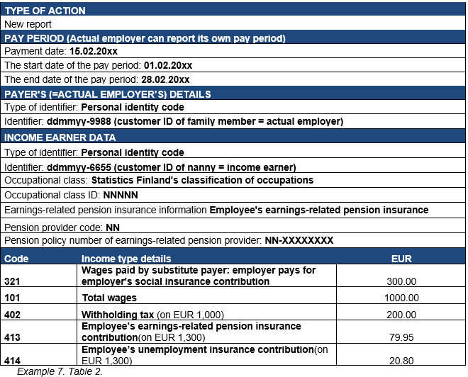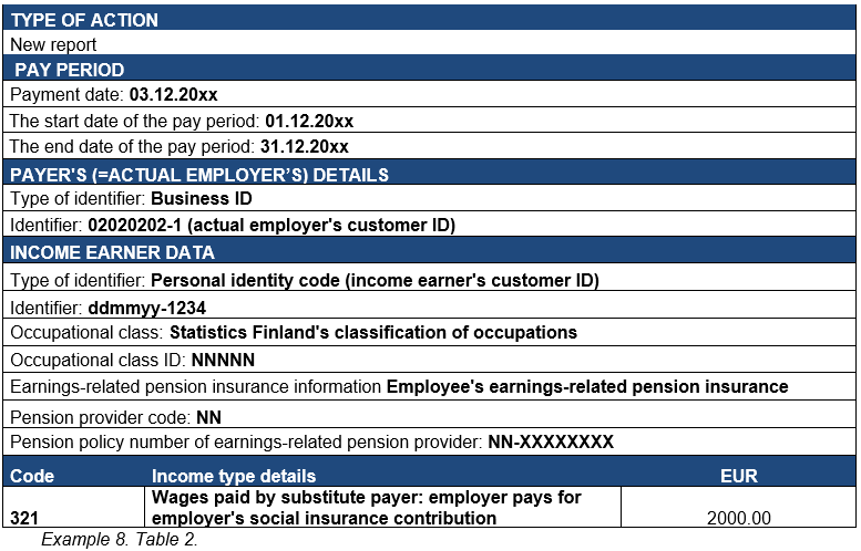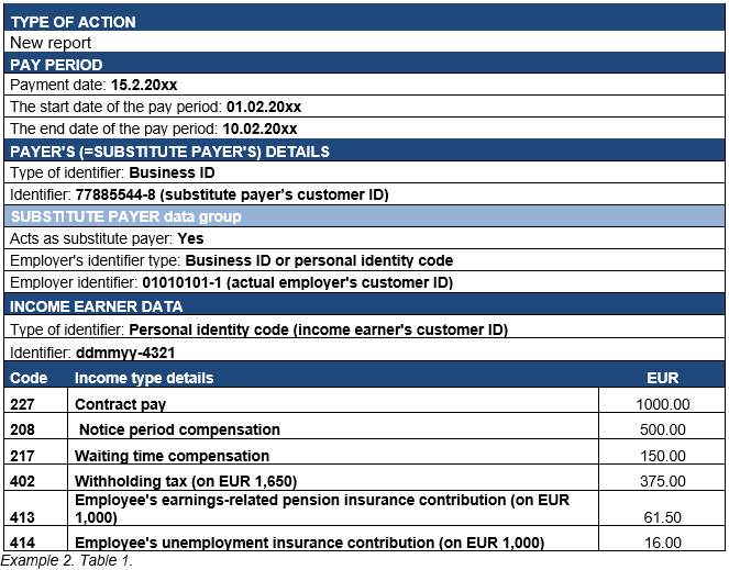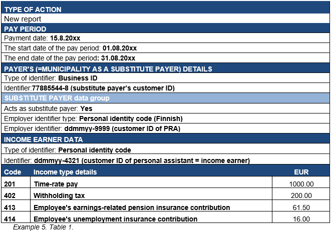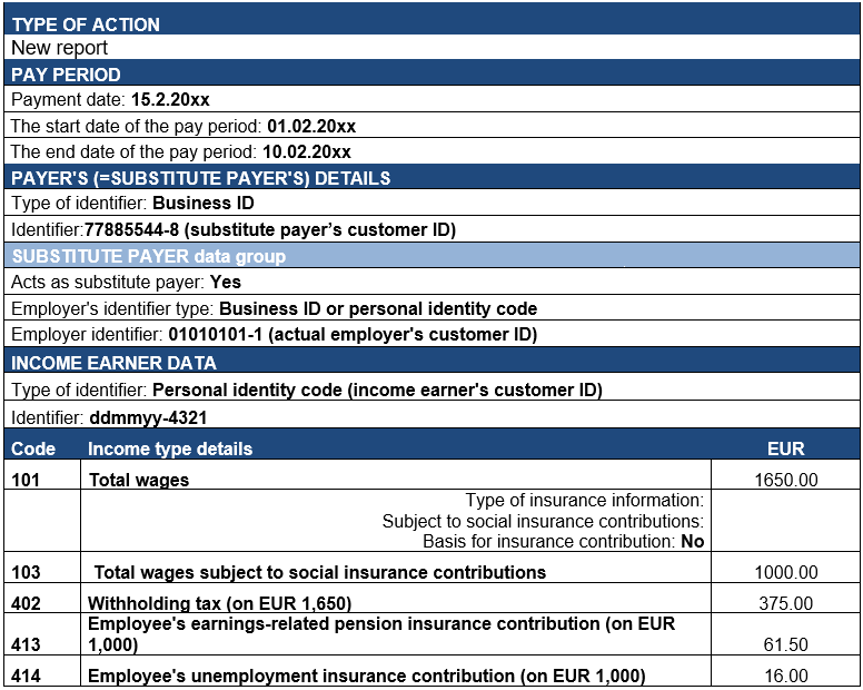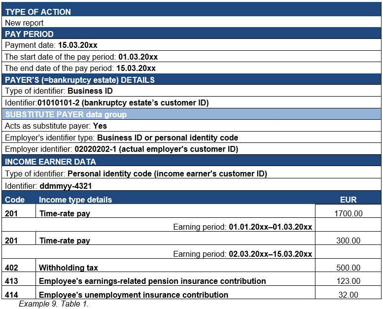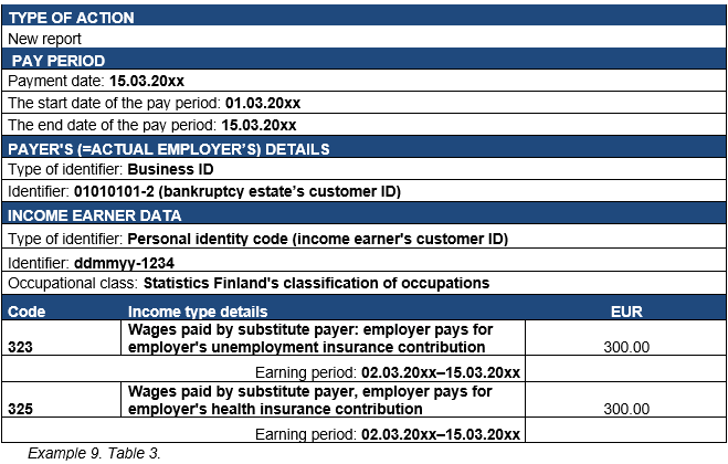 In addition, examples are provided to describe the reporting of the most common situations involving a substitute payer: reporting of payments made by Kela, a bankruptcy estate, municipalities and pay security.