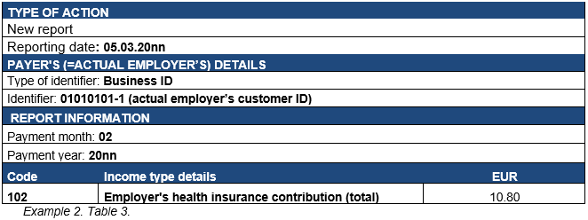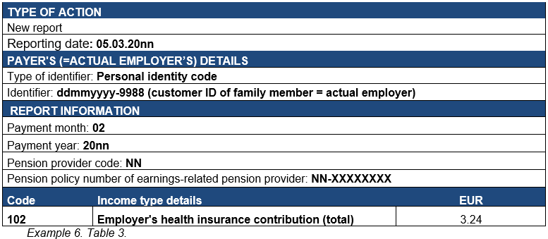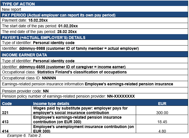 The actual employer must submit an earnings payment report to the Incomes Register using income types specified for situations involving a substitute payer (see the list below). If the wages paid to the income earner are subject to all social insurance contributions, the actual employer reports the wages under the income type: ”Wages paid by substitute payer: employer pays for the employer's social insurance contribution (earnings-related pension, health, unemployment, and occupational accident and disease insurance contributions)”. If the wages are subject only to a certain employer's contribution, the income is reported under the income type for that particular contribution. For example, if the income were subject only to the employer's health insurance contribution, it would be reported under the income type “Wages paid by substitute payer, employer pays for employer's health insurance contribution”. More than one income type intended for situations involving a substitute payer can be used for the same payment (see chapter 2.4, example 9, table 2).