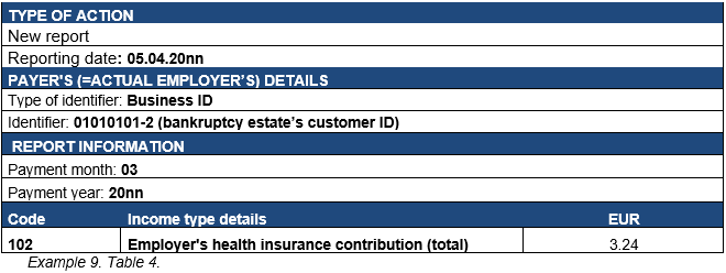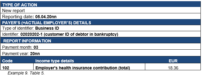 The bankruptcy estate submits reports to the Incomes Register using its own Business ID in the same manner as described in example 8 (table 1). The bankruptcy estate also submits reports to the Incomes Register on behalf of the actual employer (debtor in bankruptcy) using the actual employer’s identifier in accordance with example 8 (tables 2 and 3).
