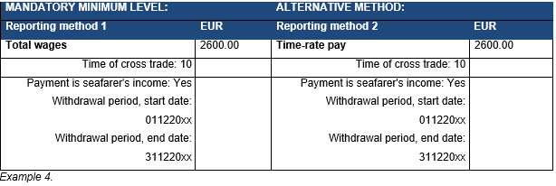 Example 4: An employee works on board a vessel for December and January. The maritime employer's pay period is one calendar month, and the wages are available for withdrawal on the last day of the wage payment month. The employee is offshore for December, due to which the December wages of EUR 2,600 are not paid to the employee's account until January. Because the income could have been withdrawn on the last day of December, it is taxable income for the year in which it could have been withdrawn. The maritime employer enters the first day of December as the start date of the withdrawal period and the last day of December, and the year as the end date. The employee's right to a cross trade deduction for March to December is also reported on the earnings payment report.