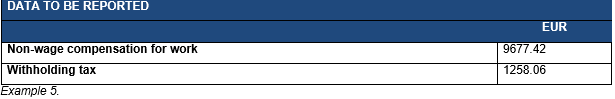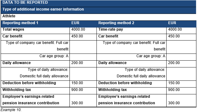 The examples in these instructions describe reporting data both as a total amount and in an itemised manner. The examples do not present all data whose submission is mandatory, only the data necessary to reporting the special circumstances described in these instructions. The reporting of withholding, for example, is not separately described. The monetary amounts used in the example are illustrative in nature, and the amount of social insurance contributions, the withholding rate and tax-exempt reimbursement of expenses must be checked annually. The withholding is determined based on the earner-specific withholding rate.
