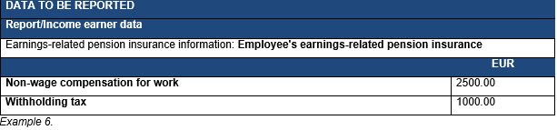 Example 6: A person completes a consulting commission for a Ministry. The person does not have a YEL insurance due to the small number of commissions. The person is not registered in the prepayment register and has provided the payer with a tax card on which the withholding rate is 40%. The Ministry reports the non-wage compensation for work to the Incomes Register using the income type Non-wage compensation for work and the tax it withheld using the income type Withholding tax. The Ministry does not report the employee's earnings-related pension insurance contribution it collected from the person.