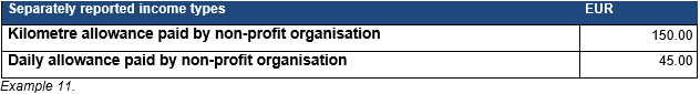 Example 11: As agreed in advance, a non-profit organisation paid EUR 150 of tax-exempt kilometre allowances to its voluntary instructor for running children's exercise sessions. The instructor also represented the organisation at a general assembly, with the organisation paying one tax-exempt daily allowance and one partial daily allowance (totalling EUR 45) for the trip, as well as train tickets and accommodation in a hotel. The organisation reports the kilometre allowance and the daily allowances to the Incomes Register. The public transport ticket and reimbursement of accommodation expenses are not reported.