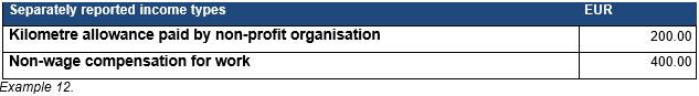 In November, EUR 600 more in kilometre allowance is paid to the same athlete for a competition trip. In November, the sports club reports EUR 200 using the income type Kilometre allowance paid by non-profit organisation and the taxable part exceeding EUR 2,000, EUR 400, using the income type Non-wage compensation for work.