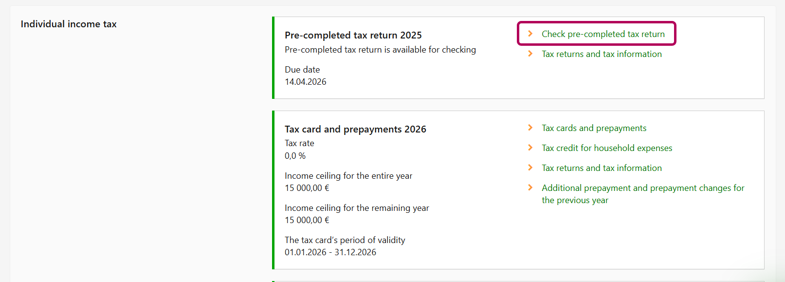 In the Individual income tax section, click the Check pre-completed tax return link under Pre-completed tax return 2025.