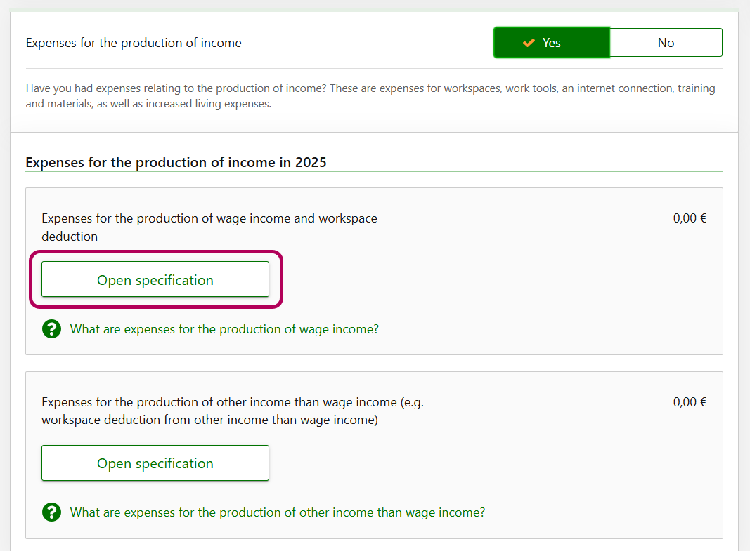Then click Open specification under Expenses for the production of wage income and workspace deduction.