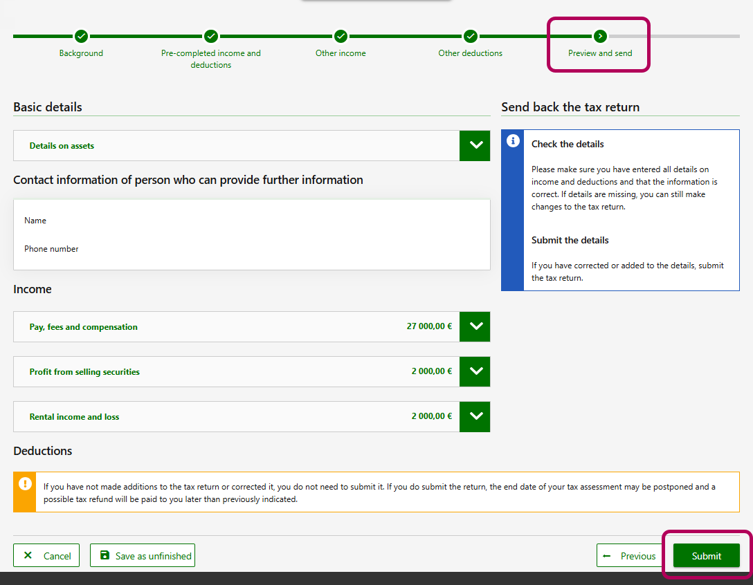 - If you wish to continue filling in the details later, select Save as unfinished. Information saved as unfinished is stored for 2 weeks. The Tax Administration will not process the information before you have submitted it.