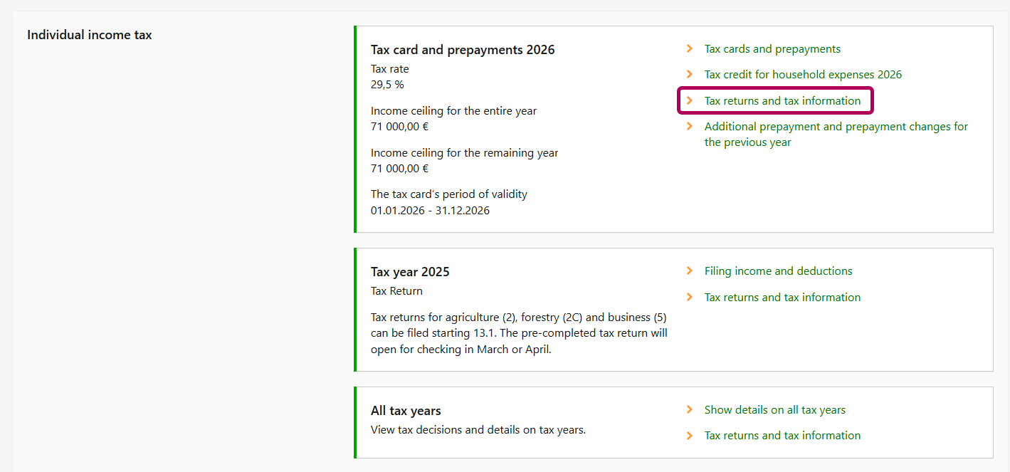 Go to the Individual income tax section, select Tax card and prepayment 2026 and click the Tax returns and tax information link.