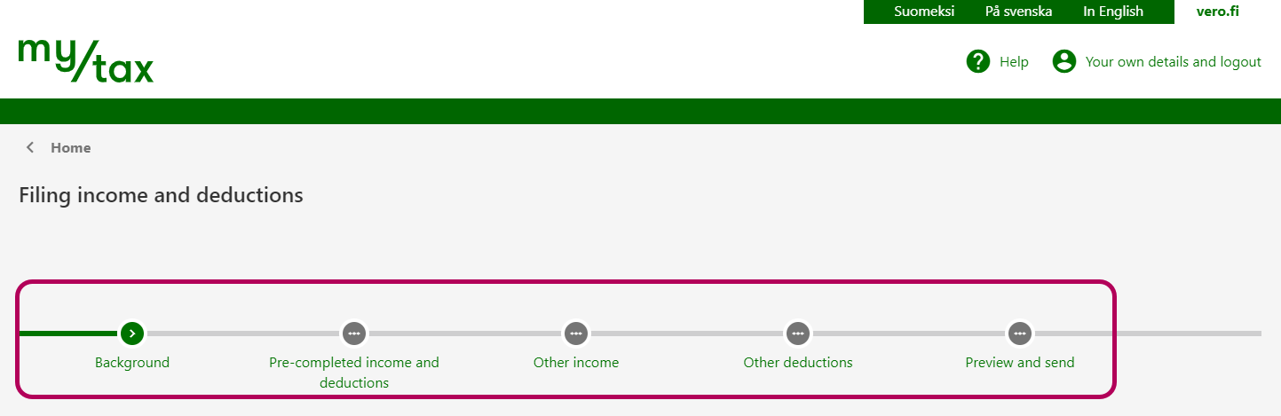 If you have filed tax credit for household expenses previously for your tax card or prepayments, you can see it in the Pre-completed income and deductions stage. Correct details, if necessary, in this stage. The details are also shown pre-completed if you have agreed with the company that performed the work that it files the information for you.