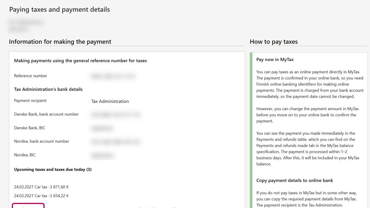 Alternatively, you can pay the tax in your e-bank. You will need the reference number and the Tax Administration’s bank account number to make the payment.