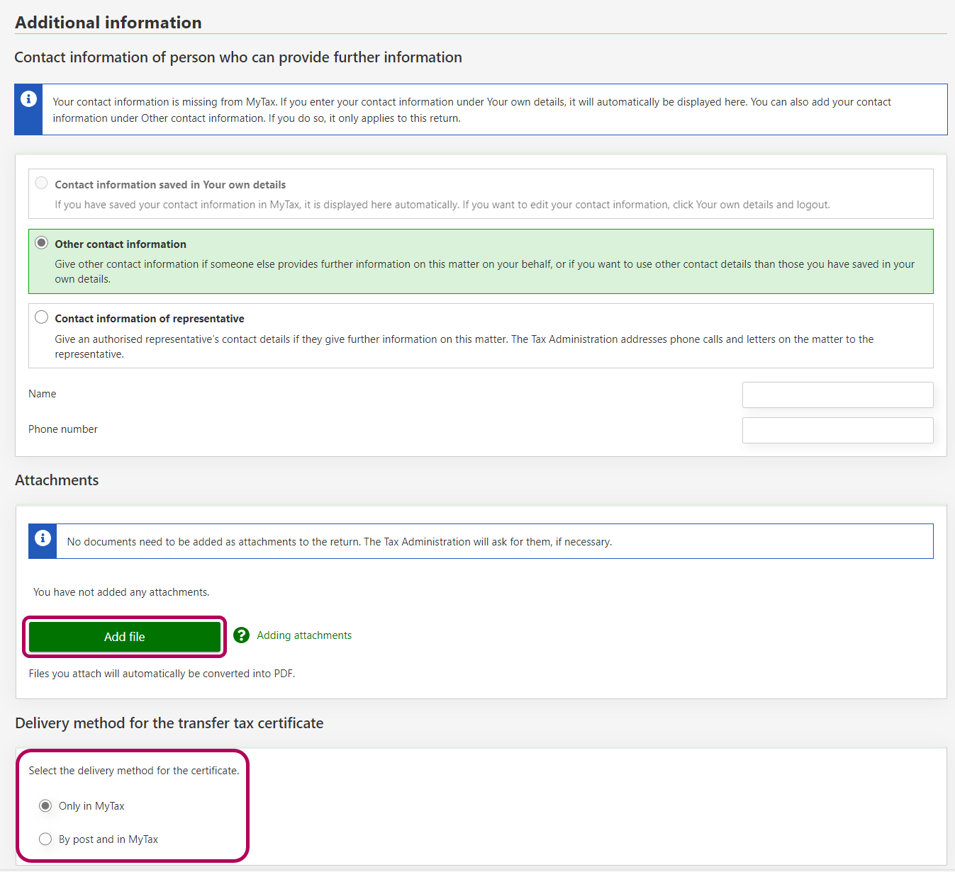 - Select the delivery method for the transfer tax certificate. You will not see this selection if you have activated Suomi.fi Messages. In that case, you will receive the certificate automatically in MyTax only.
