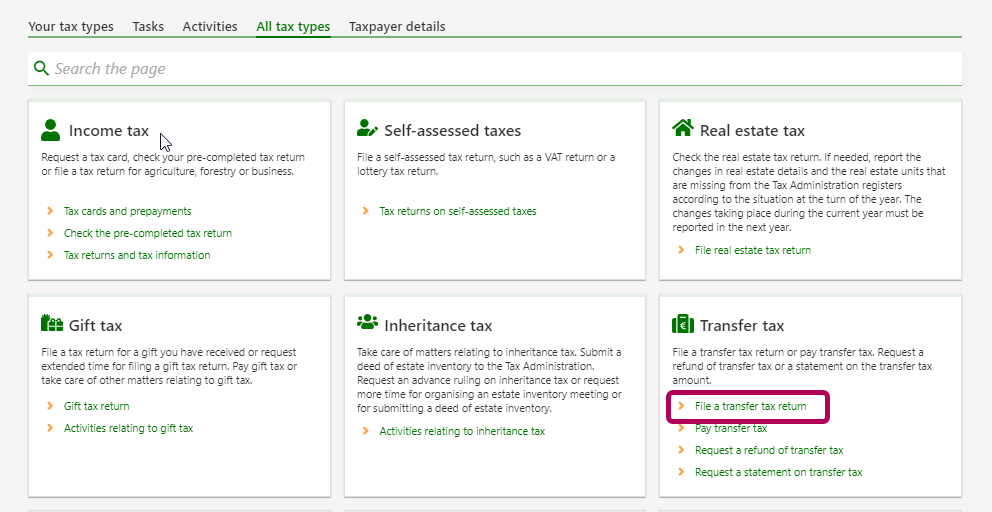 After you have filed and paid the transfer tax, you will receive a certificate of the transfer tax in MyTax. This usually takes about 2 working days. Finding the certificate in MyTax.