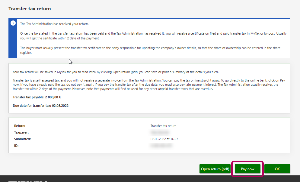 If you have not yet paid the transfer tax, move on to make the payment by clicking Pay now.