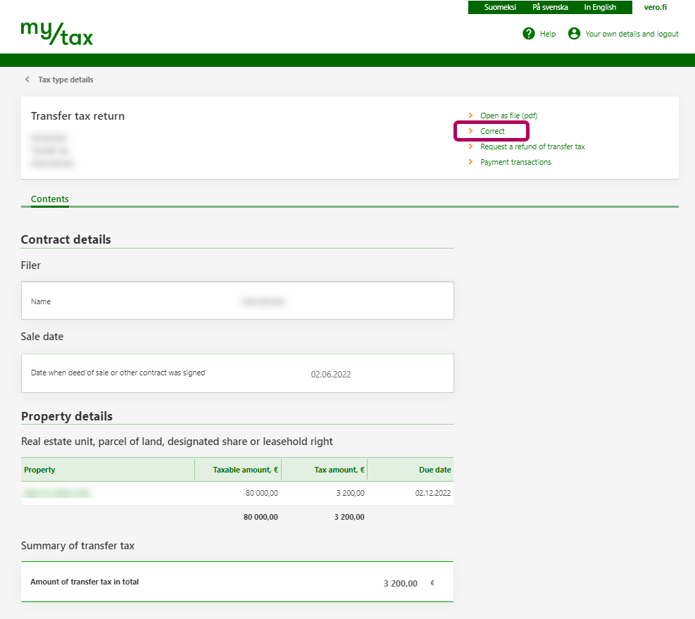 Liisa corrects her transfer tax return in MyTax: she adds the amount of the increase and pays an additional €1,600 in transfer tax.