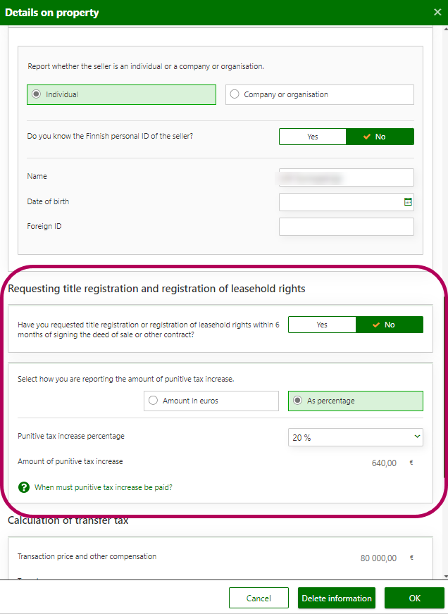 Example: Liisa bought a house for €100,000 on 3 October 2022. She filed the transfer tax return and paid the transfer tax on time. However, she forgot to apply for the registration of title to the property. She should have submitted the application by 3 April 2023, but she did not do so until 11 October 2023. Because of this, Liisa must pay a punitive tax increase.