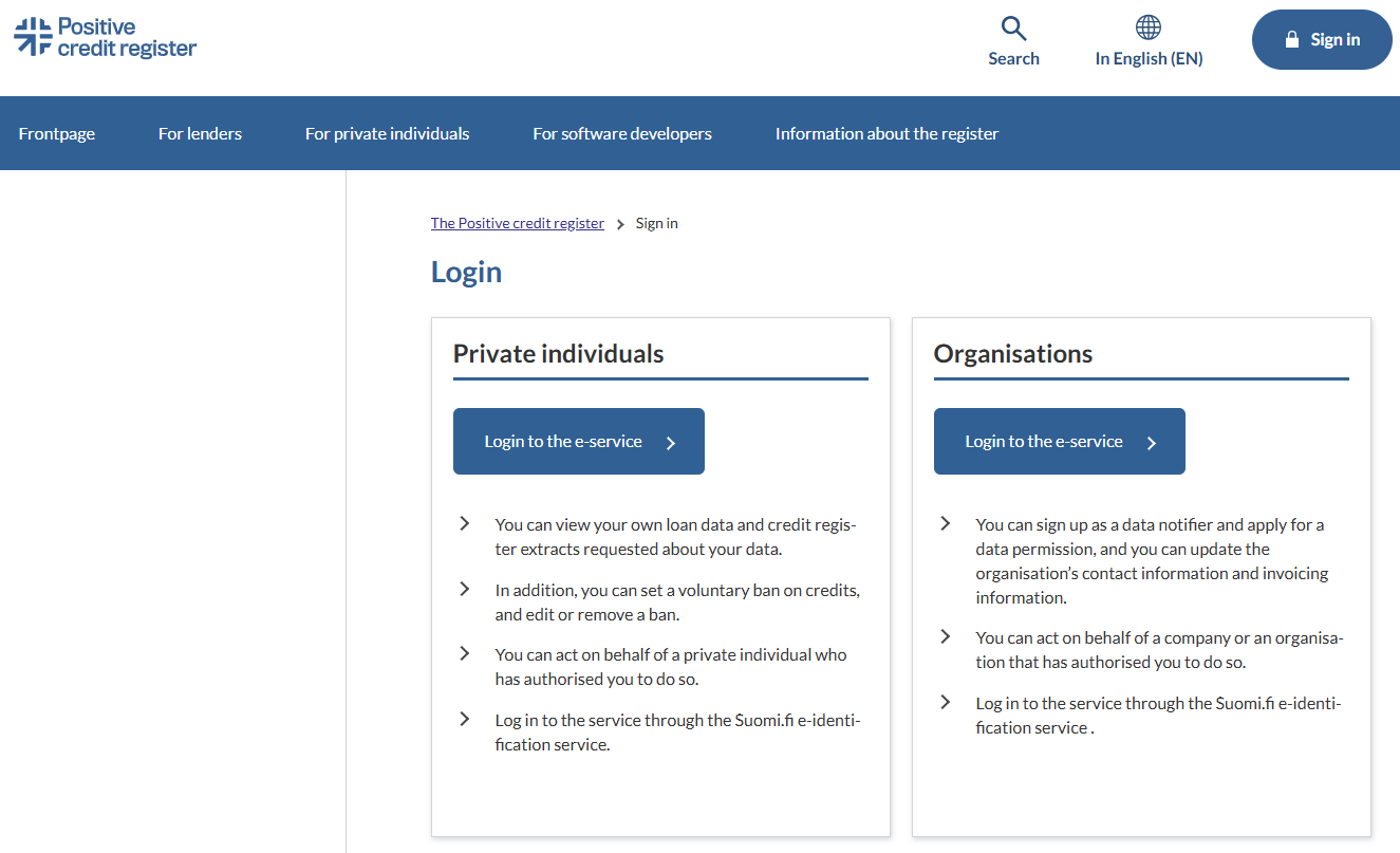 If you use the e-service on behalf of another person, you can do the same things in the service as the person who authorised you could do. In other words, you are entitled to view loan information, the guarantees provided and the credit register extracts requested by lenders. You can set, edit or remove a voluntary ban on credits, and give or remove consent to disclosure of information on a credit ban to credit information companies. You can also enable or disable notifications regarding requested credit register extracts