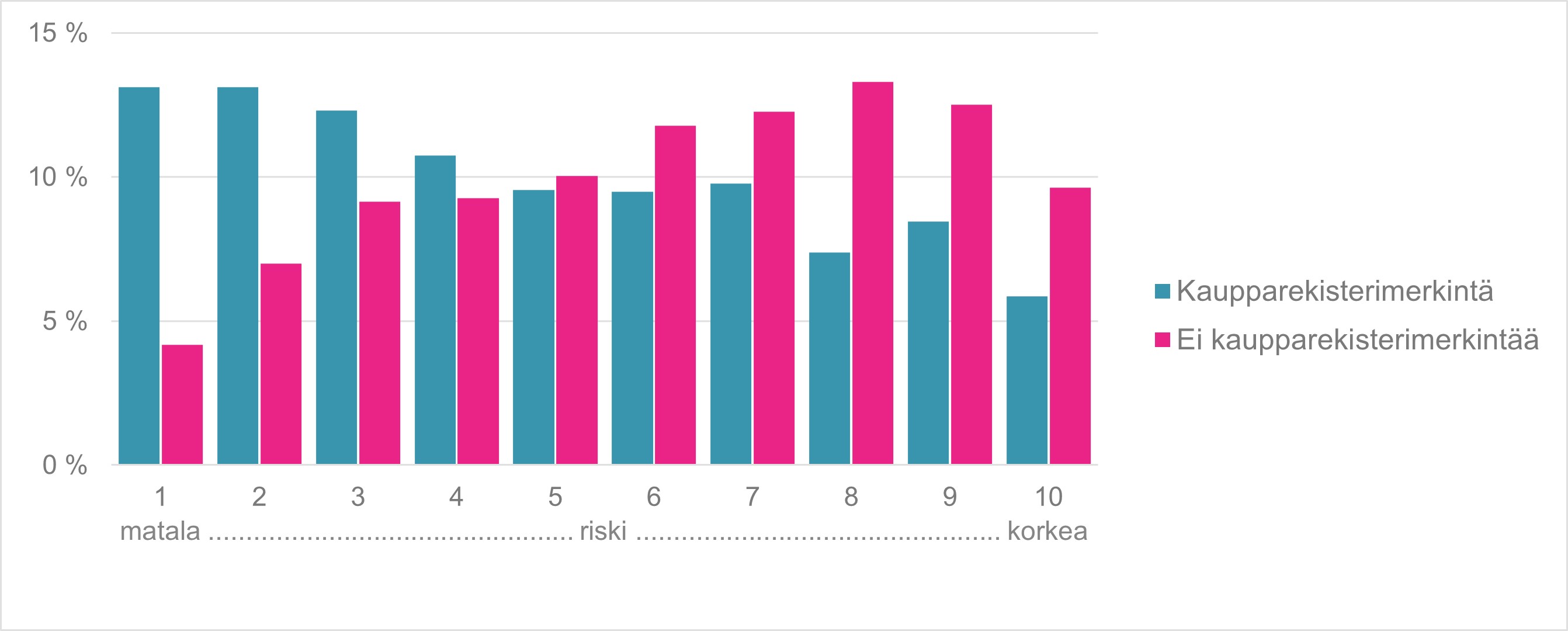 Yritysten harmaan talouden riskin suuruutta arvioitiin koneoppimismallilla. Tulokset olivat selkeitä: rekisterimerkinnän tehneet yritykset sijoittuivat useammin matalan riskin ryhmiin, kun rekisterimerkinnän laiminlyöneet painottuivat korkean riskin ryhmiin.