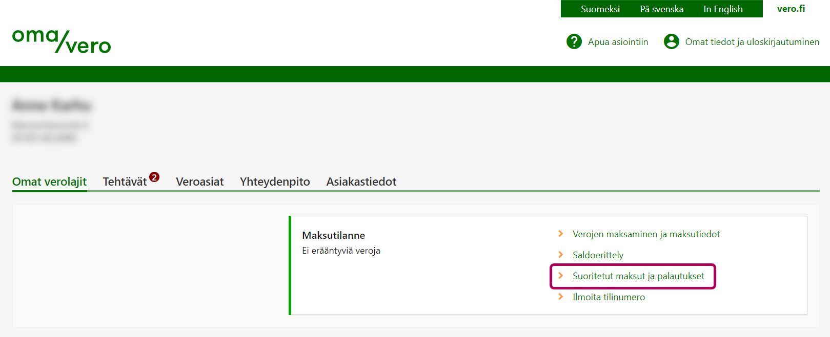 Valitse kohdasta Maksutilanne linkki Suoritetut maksut ja palautukset.