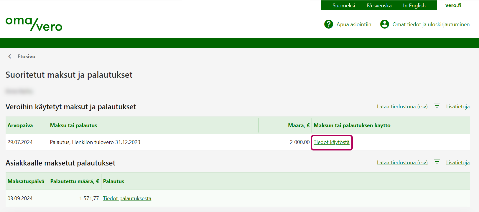 Jos veronpalautustasi on käytetty verojen maksuksi, näet tiedot käytöstä näin: Valitse taulukon "Veroihin käytetyt maksut ja palautukset" sarakkeesta Maksun tai palautuksen käyttö linkki Tiedot käytöstä.