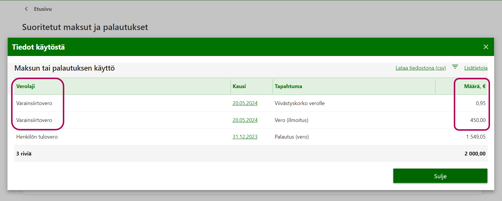 Sarakkeesta Määrä näet palautuksen määrän, joka on käytetty verojen maksuksi.