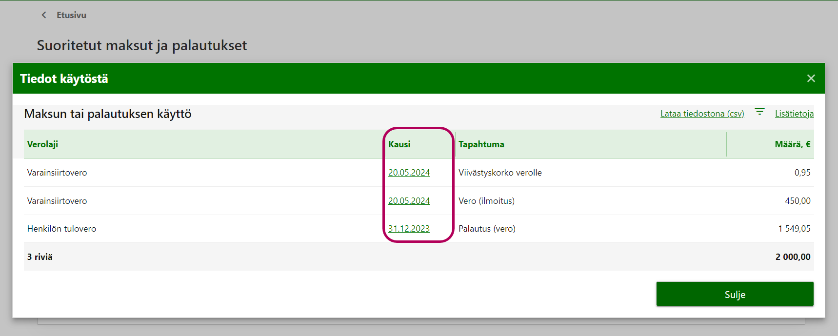 Kun valitset linkin sarakkeessa Kausi, pääset tarkastelemaan verokauden tapahtumia.