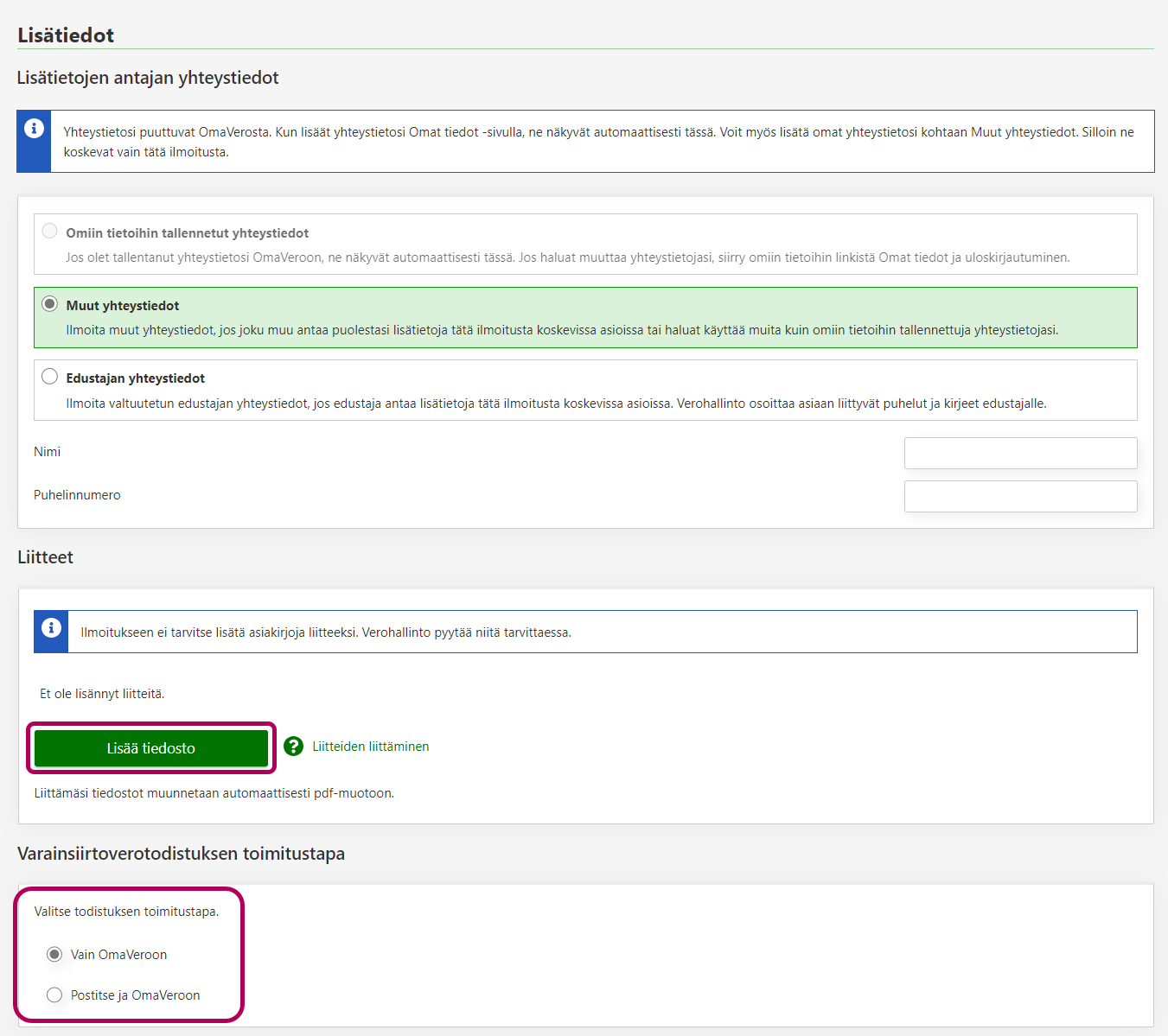 - Kohdassa Lisätietojen antajan yhteystiedot näkyvät omat yhteystietosi, jos ne ovat Verohallinnon tiedossa. Jos ilmoituksesta antaa lisätietoja joku muu, ilmoita hänen yhteystietonsa.