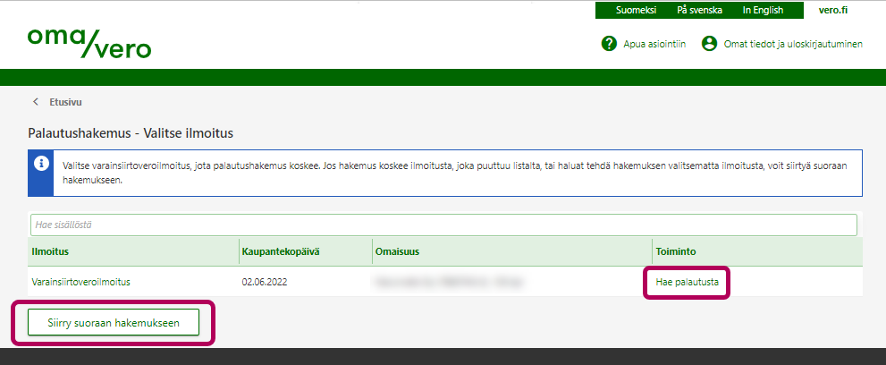 Valitse linkki Hae palautusta sen ilmoituksen kohdalta, jota hakemus koskee. Silloin aiemmin annetun varainsiirtoveroilmoituksen tiedot näkyvät valmiina palautushakemuksessa.