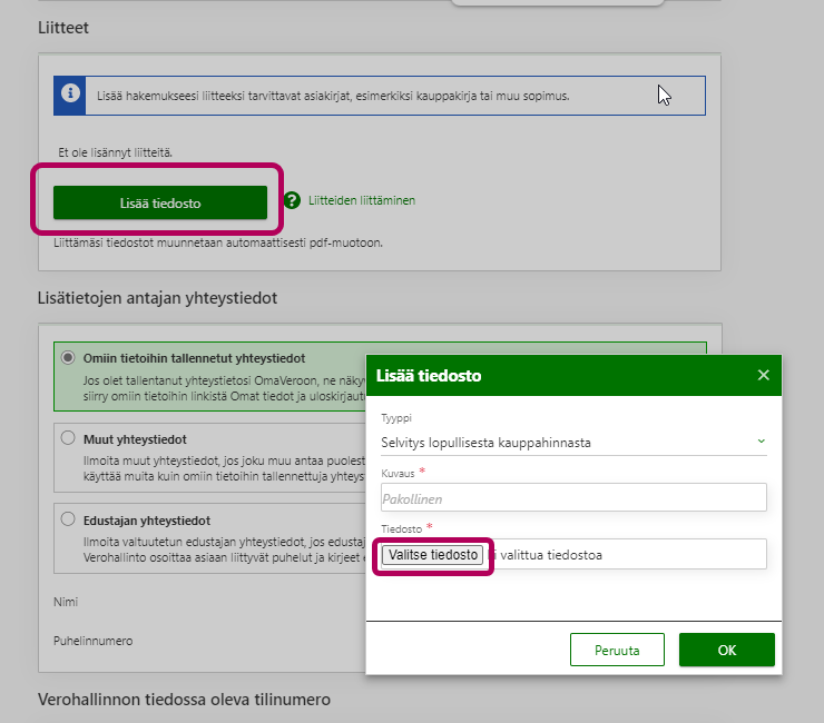 Lisää liitteeksi kauppakirja tai muu sopimus sekä muut tarvittavat asiakirjat painikkeesta Lisää tiedosto.