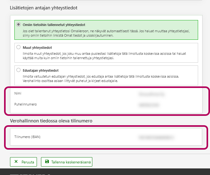 Kohdassa Lisätietojen antajan yhteystiedot näkyvät Verohallinnon tiedossa olevat yhteystiedot. Jos hakemuksesta antaa lisätietoja joku muu, ilmoita hänen yhteystietonsa.