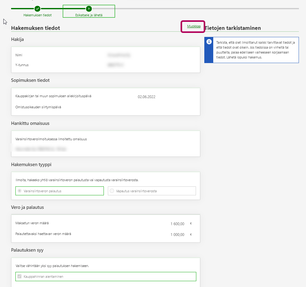 Tarkista hakemuksen tiedot. Tarvittaessa pääset vielä muokkaamaan tietoja linkistä Muokkaa. Kun kaikki tiedot ovat oikein, valitse painike Lähetä.