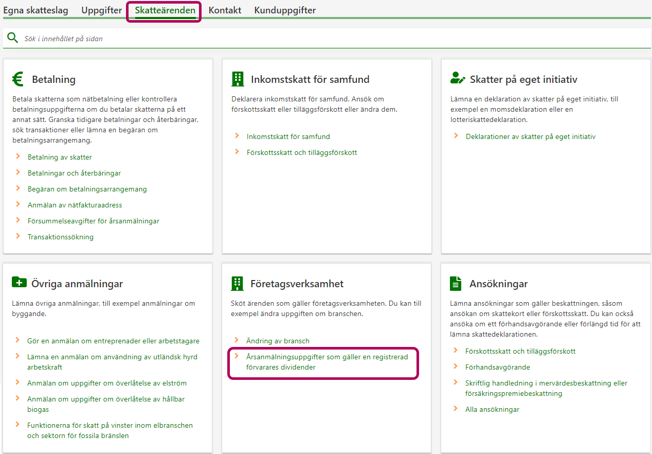 1. Du kan granska årsanmälningsuppgifter på fliken Skatteärenden. Välj länken Årsanmälningsuppgifter som gäller en registrerad förvarares dividender  i punkten Företagsverksamhet.