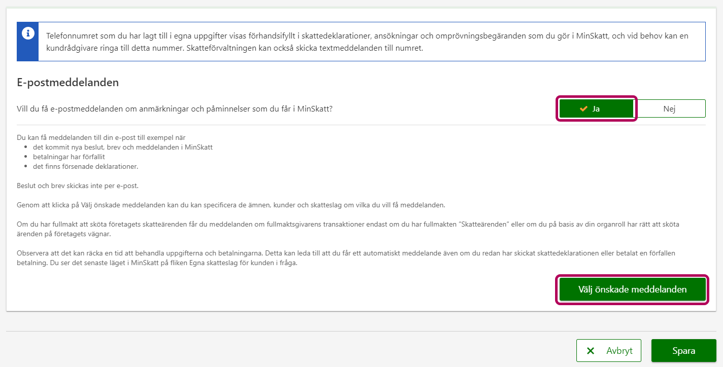 2. Om du vill få meddelanden till din e-post om anmärkningar och påminnelser i MinSkatt ska du kontrollera att du valt alternativet Ja.
