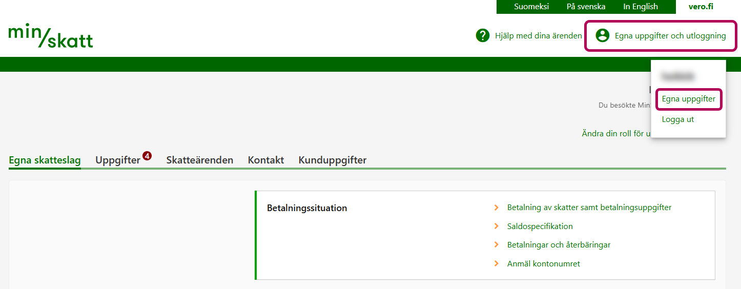 Välj länken Egna uppgifter och utloggning och sedan länken Egna uppgifter.