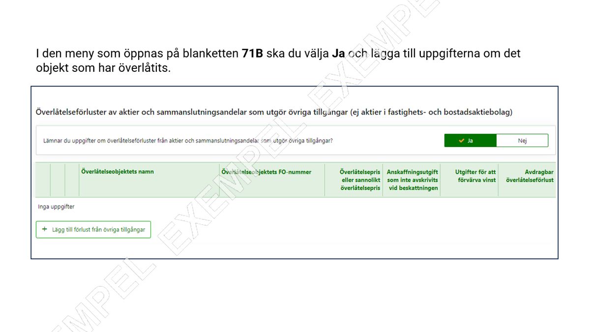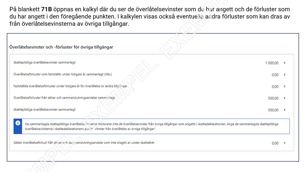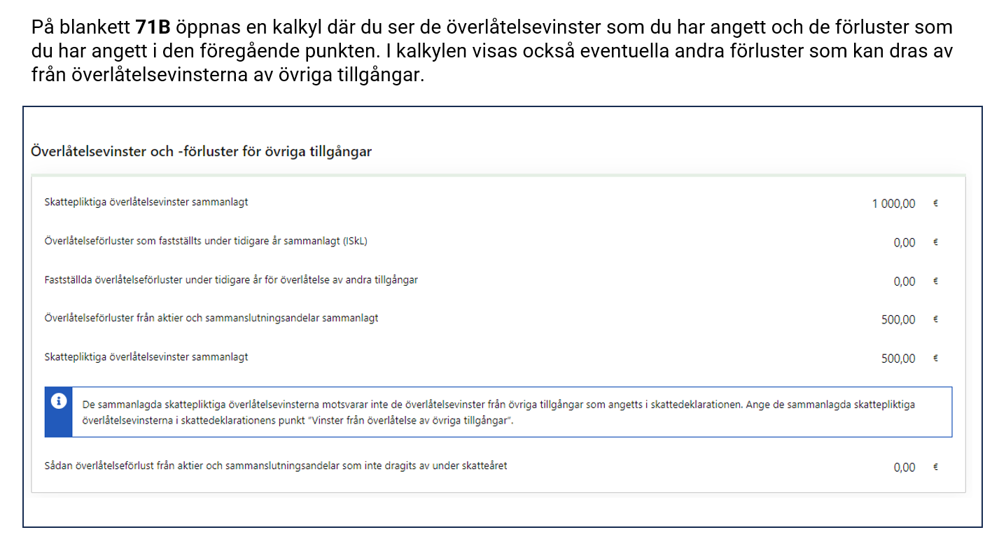 På blankett 71B öppnas en kalkyl där du ser de överlåtelsevinster som du har angett och de förluster som du har angett i den föregående punkten. I kalkylen visas också eventuella andra förluster som kan dras av från överlåtelsevinsterna av övriga tillgångar.