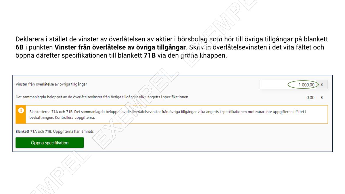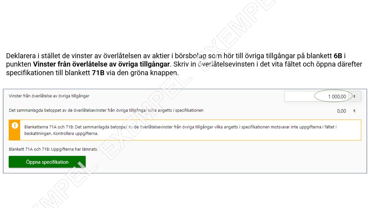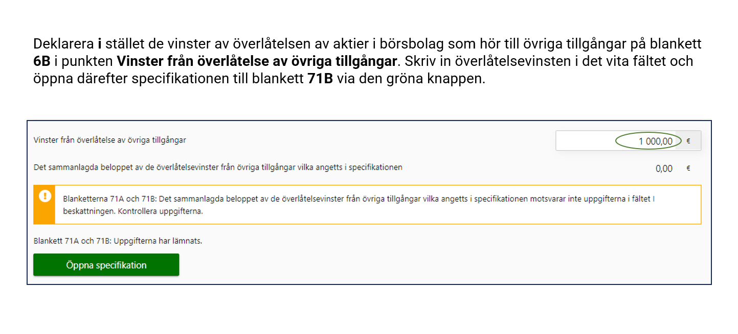 Deklarera i stället de vinster av överlåtelsen av aktier i börsbolag som hör till övriga tillgångar på blankett 6B i punkten Vinster från överlåtelse av övriga tillgångar. Skriv in överlåtelsevinsten i det vita fältet och öppna därefter specifikationen till blankett 71B via den gröna knappen.