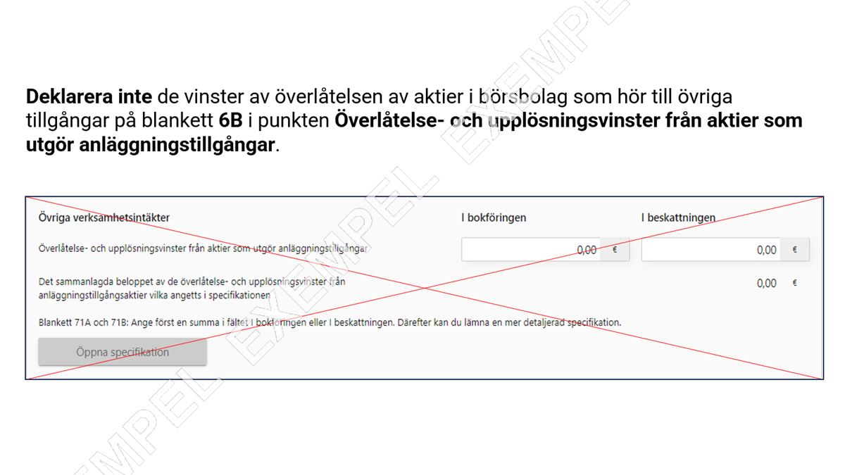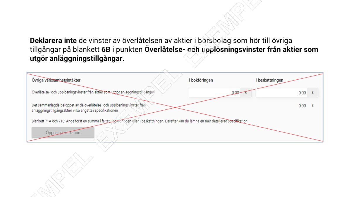 Deklarera inte de vinster av överlåtelsen av aktier i börsbolag som hör till övriga tillgångar på blankett 6B i punkten Överlåtelse- och upplösningsvinster från aktier som utgör anläggningstillgångar.