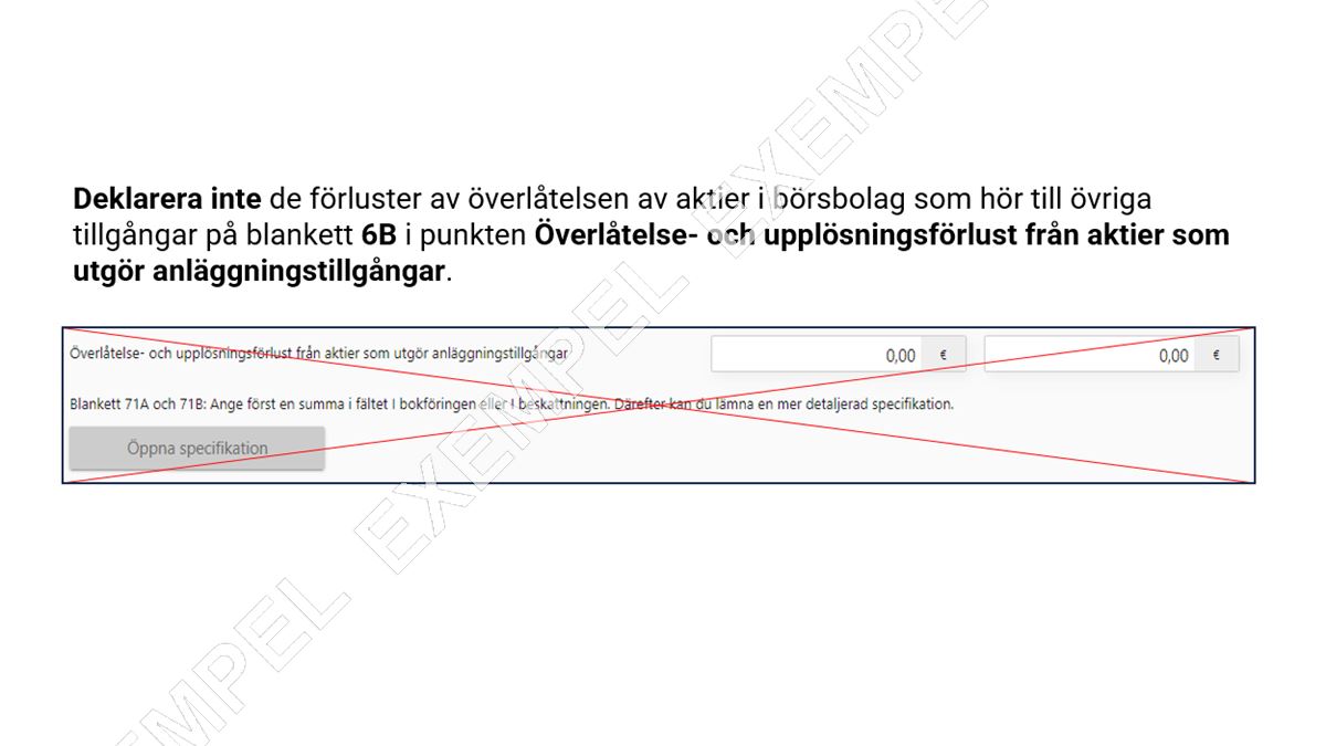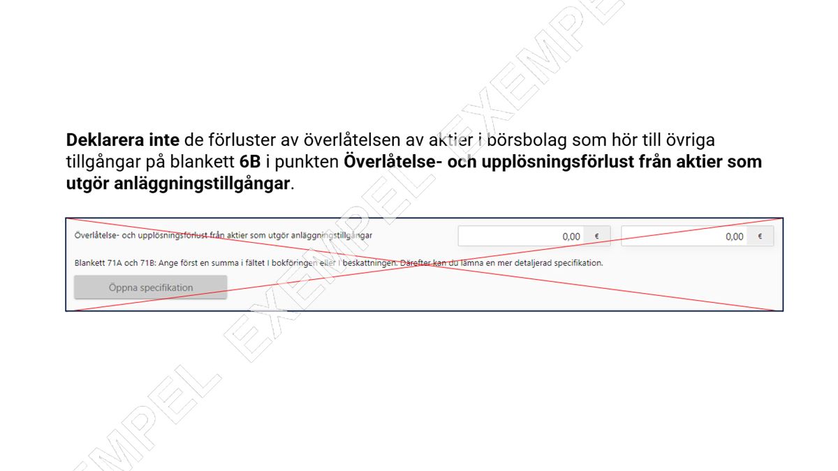 Deklarera inte de förluster av överlåtelsen av aktier i börsbolag som hör till övriga tillgångar på blankett 6B i punkten Överlåtelse- och upplösningsförlust från aktier som utgör anläggningstillgångar.