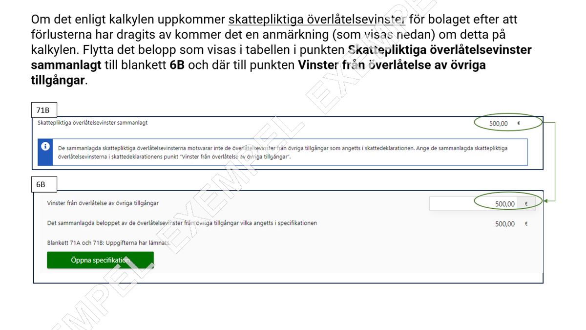 Om det enligt kalkylen uppkommer skattepliktiga överlåtelsevinster för bolaget efter att förlusterna har dragits av kommer det en anmärkning (som visas nedan) om detta på kalkylen. Flytta det belopp som visas i tabellen i punkten Skattepliktiga överlåtelsevinster sammanlagt till blankett 6B och där till punkten Vinster från överlåtelse av övriga tillgångar.