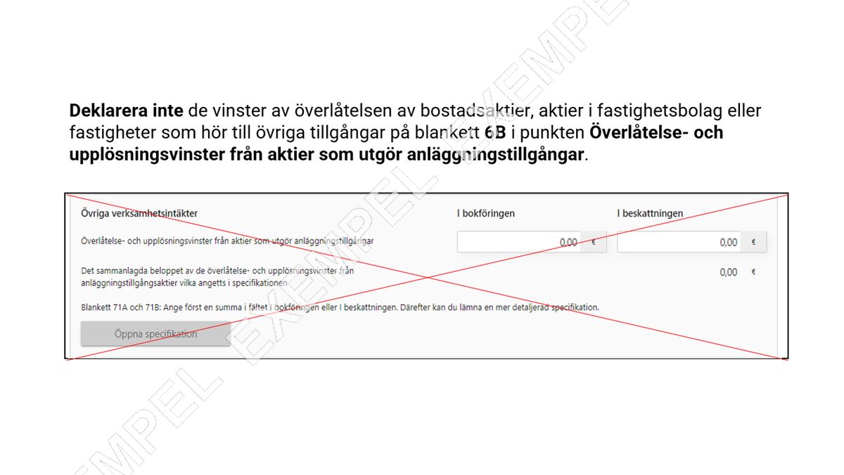 Deklarera inte de vinster av överlåtelsen av bostadsaktier, aktier i fastighetsbolag eller fastigheter som hör till övriga tillgångar på blankett 6B i punkten Överlåtelse- och upplösningsvinster från aktier som utgör anläggningstillgångar.
