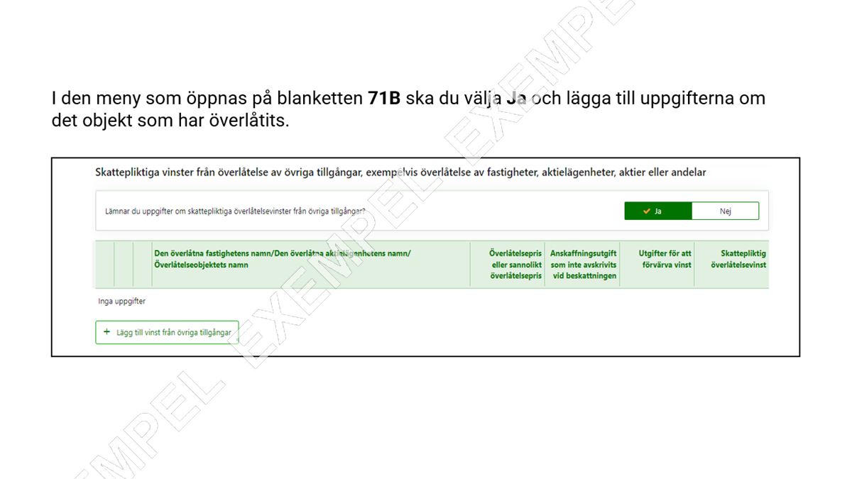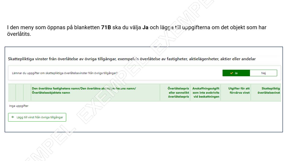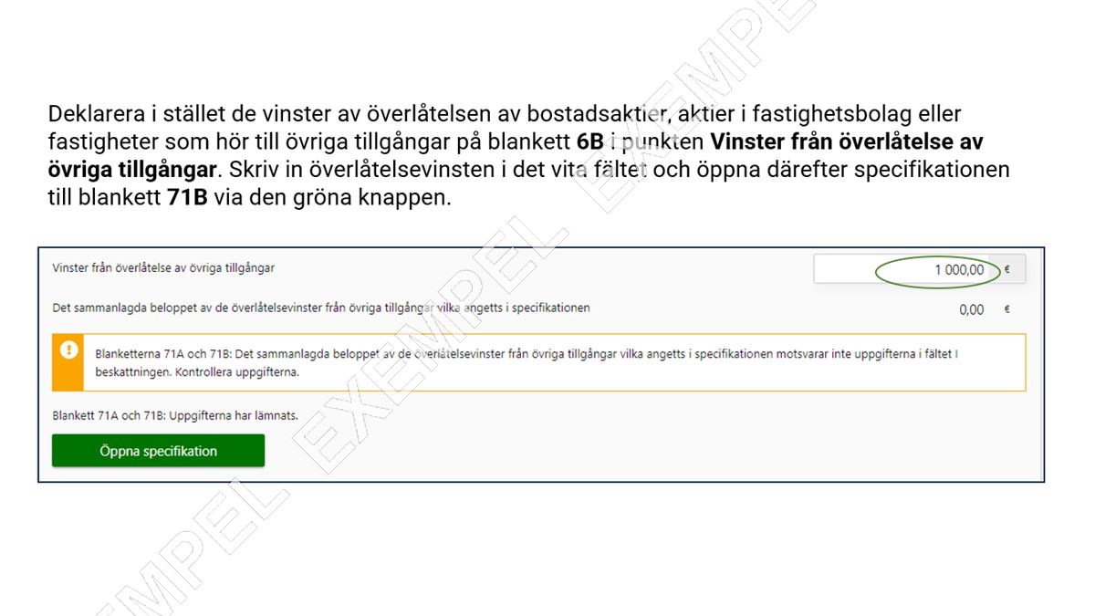 Deklarera i stället de vinster av överlåtelsen av bostadsaktier, aktier i fastighetsbolag eller fastigheter som hör till övriga tillgångar på blankett 6B i punkten Vinster från överlåtelse av övriga tillgångar. Skriv in överlåtelsevinsten i det vita fältet och öppna därefter specifikationen till blankett 71B via den gröna knappen.
