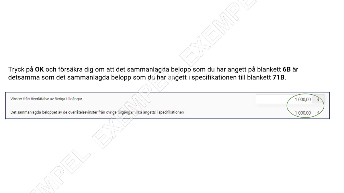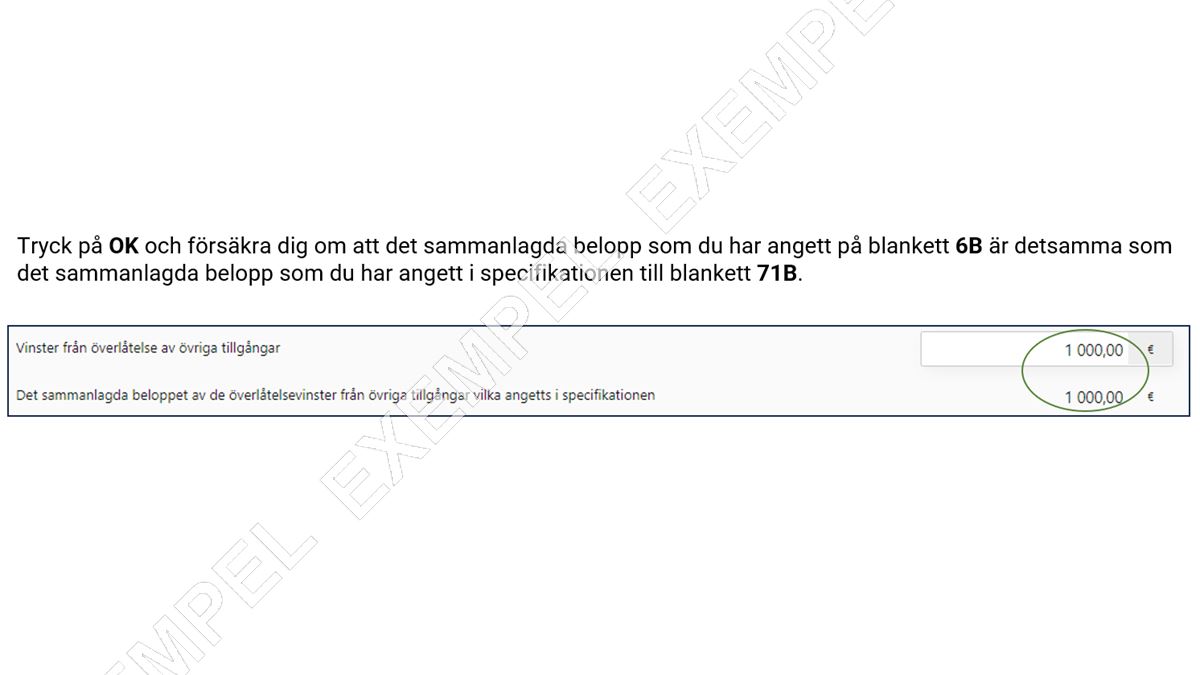 Tryck på OK och försäkra dig om att det sammanlagda belopp som du har angett på blankett 6B är detsamma som det sammanlagda belopp som du har angett i specifikationen till blankett 71B.