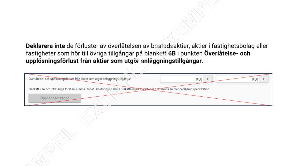 Deklarera inte de förluster av överlåtelsen av bostadsaktier, aktier i fastighetsbolag eller fastigheter som hör till övriga tillgångar på blankett 6B i punkten Överlåtelse- och upplösningsförlust från aktier som utgör anläggningstillgångar.