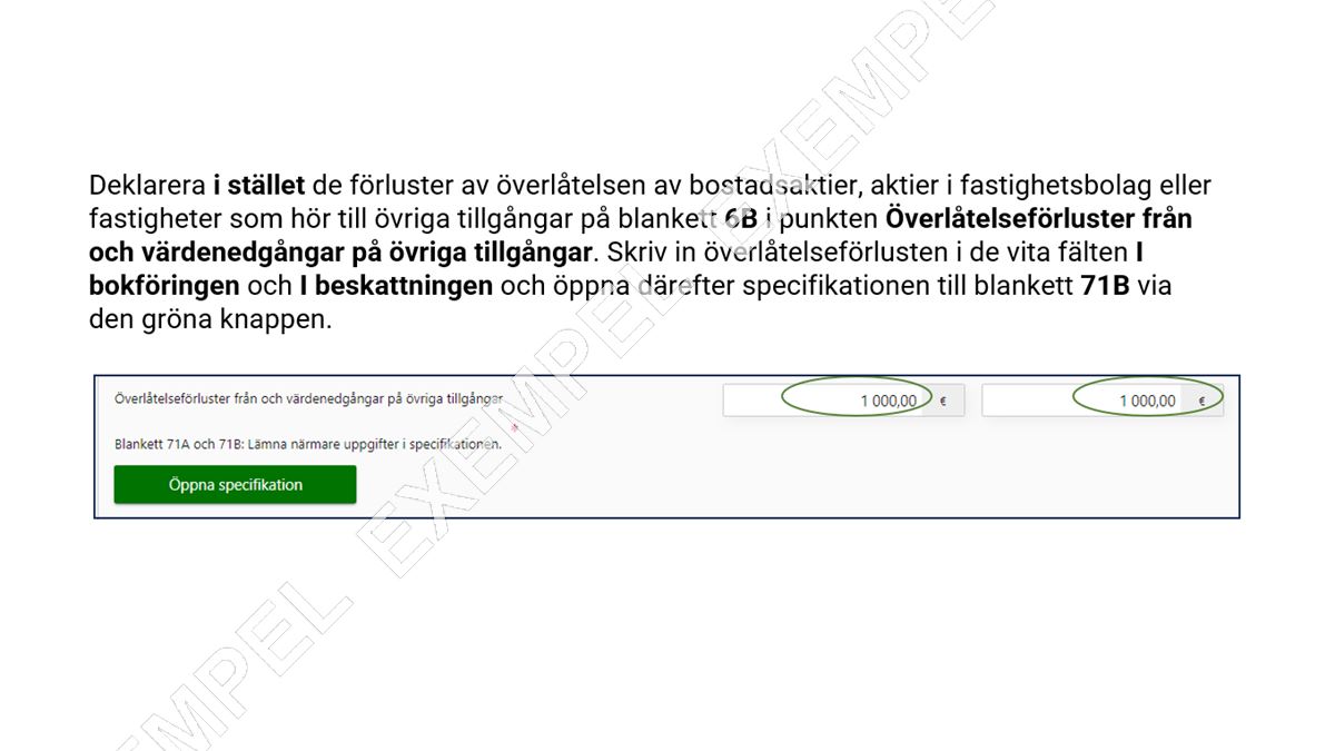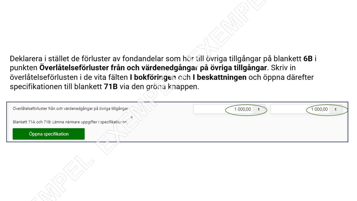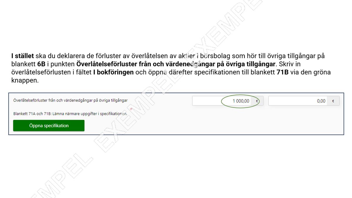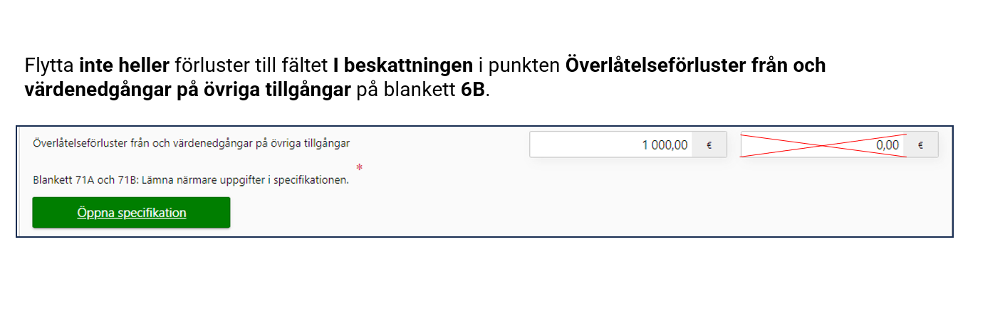 I stället ska du deklarera de förluster av överlåtelsen av aktier i börsbolag som hör till övriga tillgångar på blankett 6B i punkten Överlåtelseförluster från och värdenedgångar på övriga tillgångar. Skriv in överlåtelseförlusten i fältet I bokföringen och öppna därefter specifikationen till blankett 71B via den gröna knappen.